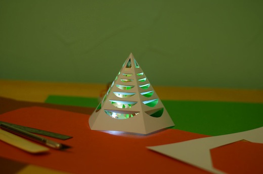 Come potete vedere nell’immagine qui sopra si tratta di un albero di Natale a piramide luminoso ideato da Sparkle Labs Electronics Kits, dove la luce filtrata dai buchi produce un effetto molto particolare sul muro.